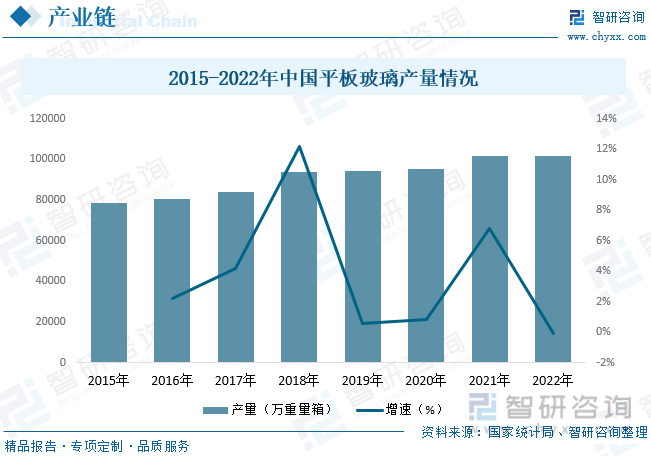 纯碱是一种重要的无机化工原料,主要用于平板玻璃、玻璃制品和陶瓷釉的生产,此外还广泛用于生活洗涤、酸类中和以及食品加工等领域。其中玻璃是纯碱最大的下游应用领域,占比在七成左右。从我国平板玻璃行业来看,在国内持续推进玻璃行业供给侧改革、淘汰过剩产能的同时,受益于房地产投资保持韧性,我国平板玻璃产销呈现平稳增长态势。据资料显示,2022年我国平板玻璃产量为101620.8万重量箱,同比下降0.1%。
