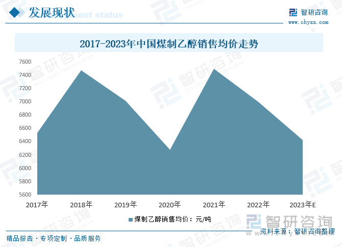 2017年以来我国煤制乙醇销售均价在6000~7500元/吨之间波动,2022年我国煤制乙醇销售均价下滑至7000元/吨,预计2023年我国煤制乙醇销售均价约为6430元/吨。