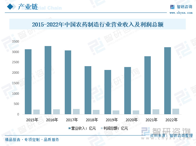 中国农药的发展始于20世纪50年代,那时中国刚刚解放,农业生产力亟待提高,农药作为提高农业产量的重要手段开始得到重视。最初,中国主要依赖进口农药,随着国内化工产业的发展,中国农药工业逐步兴起。中国农药的快速发展改革开放以来,中国农药行业进入了快速发展阶段。2022年中国农药制造行业规模以上企业实现营业收入3226.09亿元,同比增长约15.3%;利润总额285.02亿元,利润总额同比增长14.1%。化学农药制造业和生物化学农药及微生物农药制造业营收和利润都实现同比增长。