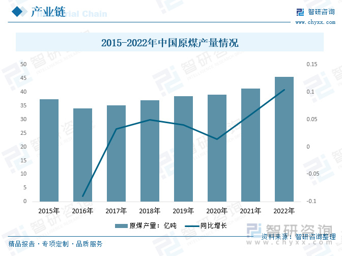 中国是世界煤炭第一储量和使用大国。目前,我国已探明的煤炭储量占世界煤炭储量总数的33.8%。2022年全国煤炭产量为45.6亿吨,比2021年增长10.41%。
