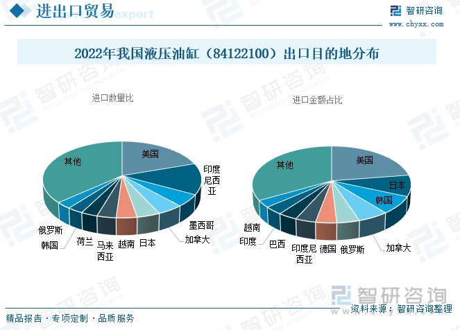 2022年,美国是我国液压油缸最大出口目的地,我国向美国出口液压油缸244.81万台,占19.73%;出口金额2.51亿美元,占22.57%。