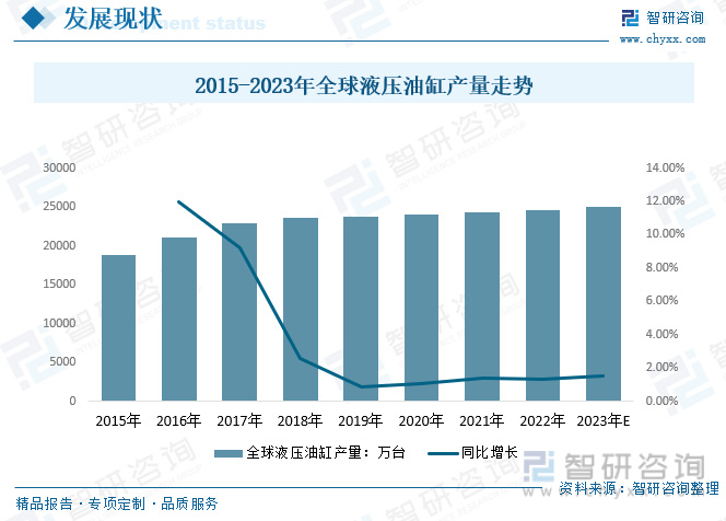 随着全球工业快速发展的拉动下,全球液压油缸产量稳定增长,2020年全球液压油缸产量从2015年的18761万台增长至23977万台,预计2023年全球液压油缸产量有望增长至25000万台。