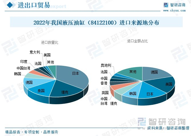从进口来源地来看,2022年我国从日本进口液压油缸85.30万台,占35.32;进口金额0.64亿美元,占14.46%;进口量排名第一,进口金额排名第三。我国从德国进口液压油缸27.09万台,占11.22%;进口金额0.88亿美元,占19.98%,进口量排名第四,进口金额排名第一。