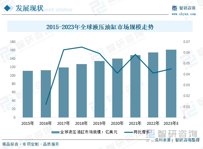 液压油缸作为一种关键的液压传动元件,广泛应用于工程机械、冶金设备、航空航天、船舶及汽车等领域。随着工业的发展和需求的增加,液压油缸市场近年来呈现出稳步增长的趋势。据不完全统计,2015年全球液压油缸市场规模达111.25亿美元,2020年全球液压油缸市场规模达140.63亿美元,预计2023年全球液压油缸市场规模约为162亿美元。