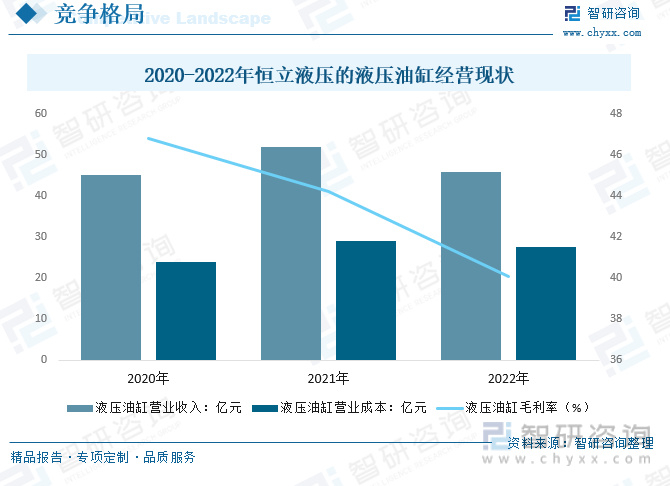 恒立液压是一家专业生产液压元件及液压系统的公司。恒立液压从液压油缸制造发展成为涵盖高压油缸、高压柱塞泵、液压多路阀、工业阀、液压系统、液压测试台及高精密液压铸件等产品研发和制造的大型综合性企业。企业公告显示,2022年恒立液压的液压油缸营业收入45.84亿元,比上年减少11.61%;液压油缸营业成本27.46亿元,比上年减少5.1%;液压油缸毛利率40.1%,4.11个百分点。