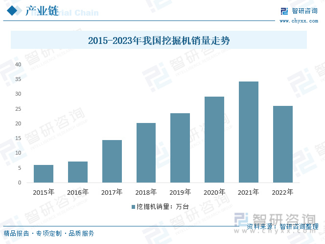2015 年我国挖掘机全年销量跌至 6.05 万台,仅约为2011年高峰期的 30%。2016 -2021年我国挖掘机销量呈逐年增长趋势,2021年我国挖掘机全年销量达到34.28万台,再创历史新高。2022年国挖掘机销26.13万台,同比下降23.8%。