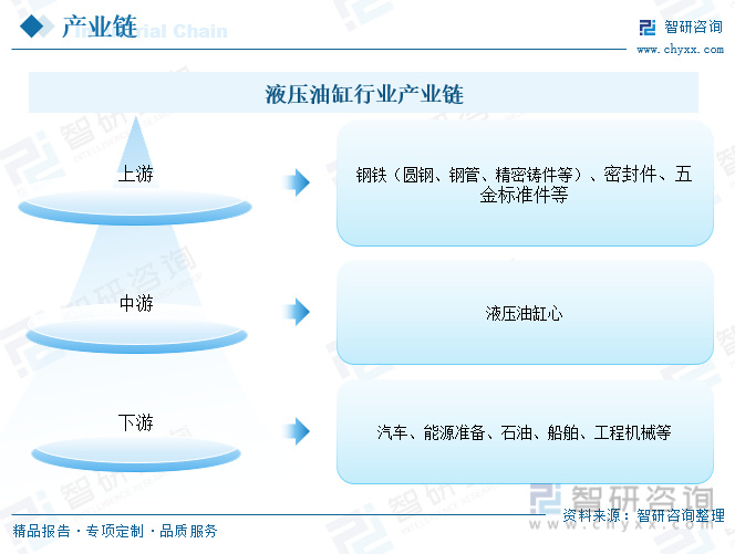 液压油缸的产业链上游企业主要为圆钢、钢管、精密铸件等钢材制造行业及密封件、五金标准件等相关配件行业;下游行业覆盖面较广,目前主要应用于汽车、能源准备、石油、船舶、工程机械等油缸需求领域。