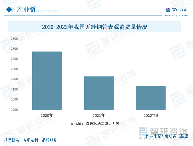 近年来国内缝钢管产量也处于逐步下滑态势,无缝钢管表观消费量呈现逐步下滑态势。2020-2022年我国无缝钢管表观消费量分别为2475.50万吨、2228.00万吨、2135.00万吨, 2021-2022年无缝钢管表观消费量分别下降10.01%、4.17%。