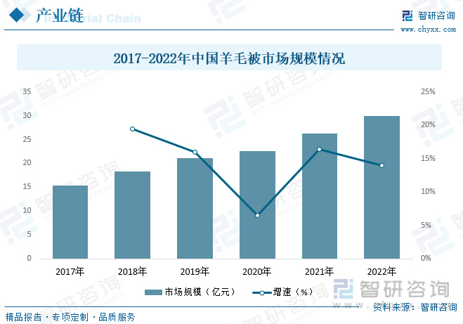 从下游市场来看,近几年羊毛被的需求了不断增长,市场规模持续上涨,由2017年的15.29亿元增长至2022年的29.88亿元,年复合增长率约为14.34%,随着人们生活质量的提高,对产品的要求和品质也将越来越高,舒适的羊毛被越来越成为人们喜爱的产品,对上游端羊毛的需求也将持续增加。