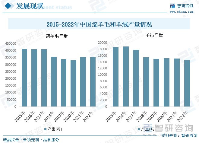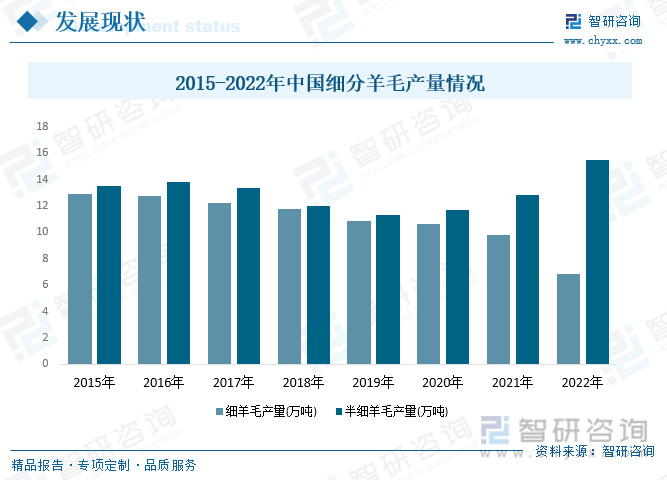 建国以来,我国畜牧科技工作者,经长期的努力,先后培育选育了绵山羊品种十多个。如新疆细毛羊、东北细毛羊、内蒙古细毛羊等。2022年中国细羊毛产量6.88万吨。2015-2022年中国半细羊毛产量总体是呈先增长后下降趋势,2016年中国半细羊毛产量13.80万吨,2017-2019年逐年下降,2020年半细羊毛产量稍有回升,2022年半细羊毛产量15.5万吨。