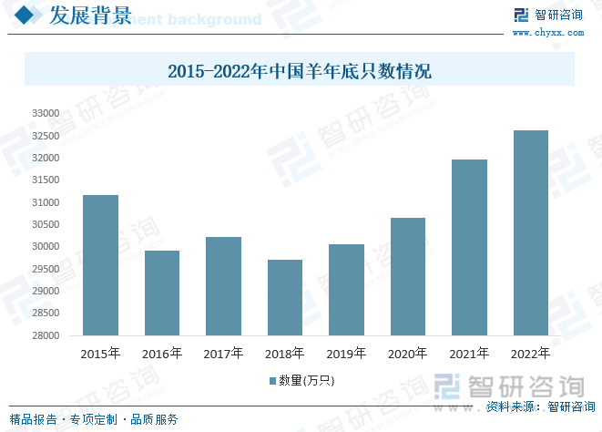 从数据来看我国羊的数量在2018年处于近几年的最低位,年底数量仅有2.97亿只,随着助农政策的不断加大,2019年到2022年我国羊只的数量持续攀升,2022年数量已达到了3.26亿只,相较于2018年增长幅度接近10%,年复合增长率约为2.37%。