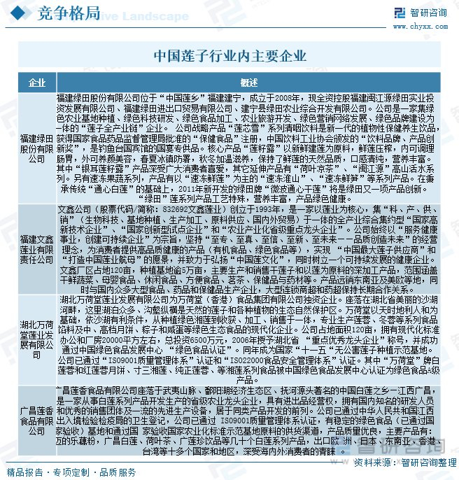 莲属植物是重要的水生经济植物,广泛分布于全国各地,其中以长江流域以南栽培较多,水田、低洼地、池塘、湖荡均可种植,近十年来发展速度很快。莲子种植、加工行业,市场需求量大,前景广阔,但行业集中度不高,市场格局较为分散,市场呈现出同质化竞争格局,价格竞争尤为激烈。此外,近年来随着政府的大力扶持以及不断增长的市场需求,行业内部竞争日趋激烈。目前,中国莲子行业内规模较大企业主要包括福建绿田股份有限公司、福建文鑫莲业有限责任公司、湖北万荷堂莲业发展有限公司、广昌莲香食品有限公司等,其中,福建绿田股份有限公司是一家以莲业为核心的全产业综合集约型重点龙头企业,一直专心致力于莲产业链种植、生产、销售、推广、服务及产业化,为实现公司“莲籽基地扩张、高新科技引领、产品质量卓越、营销网络完善、打响自主品牌、经济效益显著”的总体目标做好稳步地推进工作。