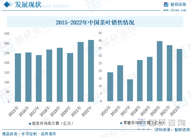 随着人们生活水平的提高,对健康饮食的要求也在不断提升,茶叶因具有多种健康功效,如抗氧化、降低血脂等,逐渐受到消费者的青睐。同时,随着茶文化的普及和推广,消费者对茶叶的认知度和接受度也在不断提高,从而推动了茶叶销量的增长。近年来,我国茶叶生产技术不断改进,茶叶品质得到了大幅提升。茶叶产区积极推广标准化生产技术,加强茶园管理,提高茶叶原料品质,从而生产出更多优质的茶叶产品,吸引了更多的消费者。2022年我国茶叶批发市场交易额为319.13亿元,零售市场交易额为34.73亿元。