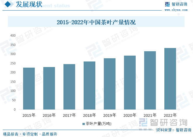 我国茶叶种植有着悠久的历史和丰富的资源,但过去由于技术限制,茶叶产量无法大幅增加。然而,随着科学技术的发展和农业技术的推广,茶叶种植者可以利用新的种植方法和工具来提高茶叶的产量和质量。在良好的效益驱动下,我国茶农的茶叶生产积极性进一步提高,茶叶产量逐渐扩大,由2015年的227.6万吨增长至2022年的334.21万吨,年复合增长率约为5.63%,保持着强劲的发展态势。