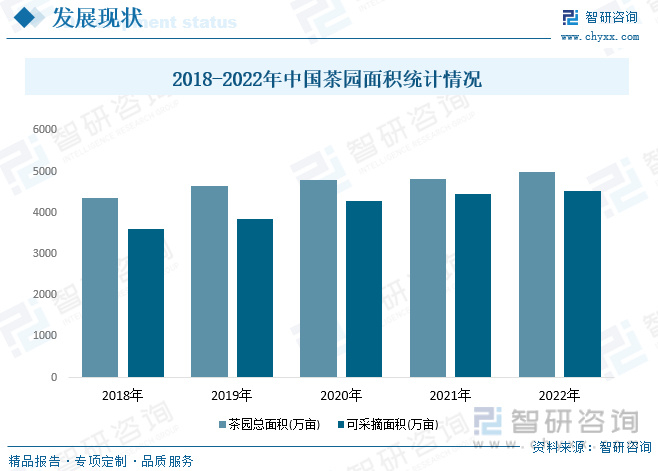 自20世纪以来,我国茶园种植面积不断扩大。根据中国茶叶流通协会的统计,截至2022年,我国共有18个主要产茶省(自治区、直辖市),茶园总面积达到4995.4万亩,比去年增加179.8万亩,同比增长3.73%,2022年我国茶园可采摘面积为453.9万亩,较去年增长了81.49万亩,同比增长1.83%。