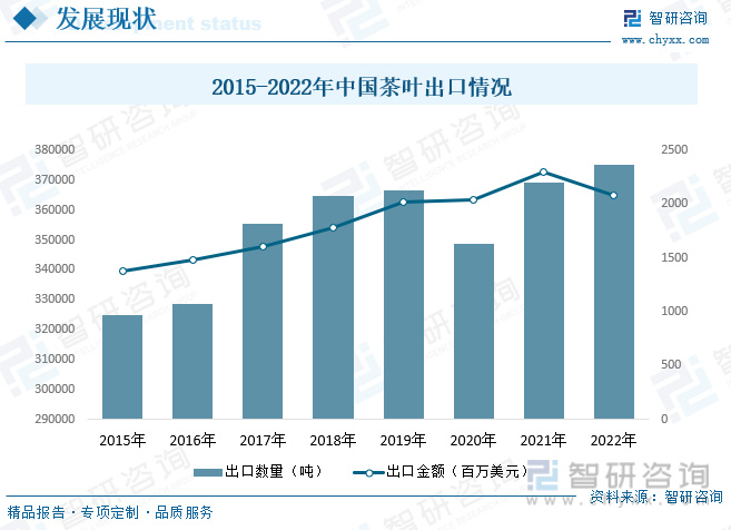 我国茶叶主要以出口贸易为主,出口规模远大于进口规模。随着近年来我国茶叶行业的快速发展,我国茶叶出口规模也随之不断扩大,2020年受疫情影响,出口规模有所下滑,随着疫情被有效控制,行业出口规模逐步回升。2022年我国茶叶出口量为37.53万吨,同比1.6%;出口金额为20.83亿美元,同比下降9.4%。