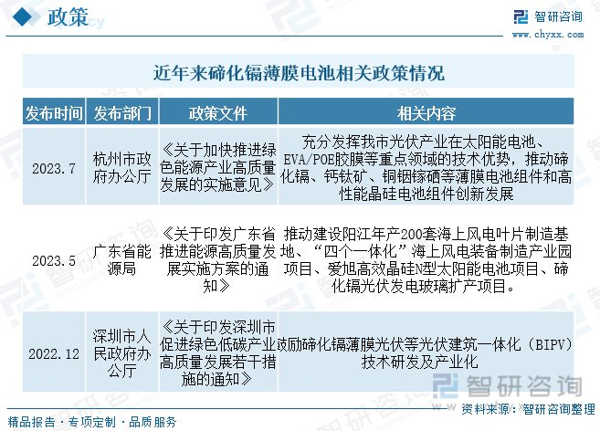 注:本文节选出自智研咨询发布的《2023年中国碲化镉薄膜太阳能电池行业发展简析:国家政策与市场价格双重驱动需求》行业分析文章,如需获取行业文章全部内容,可进入智研咨询官网搜索查看。