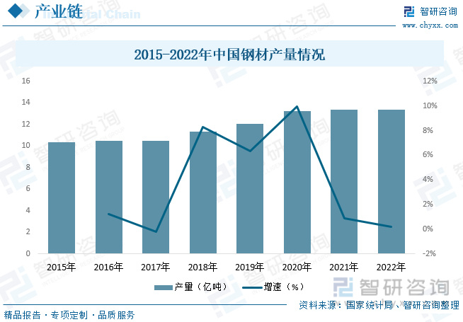 钢材是渔船制造中重要的原材料,其任何变动都可能会影响到船舶的生产质量、成本等因素。钢铁是国民经济的中流砥柱,是国家的命脉,是国家生存和发展的物质保障。钢铁工业是国民经济的重要基础产业,是国家经济水平和综合国力的重要标志,而钢材是我国钢铁行业主要产品之一。随着国际产业的转移和我国国民经济的快速发展,我国钢铁工业取得了巨大成就,钢材产量也随之不断增加。据资料显示,2022年我国钢材产量达134033.5万吨,同比增长0.3%。
