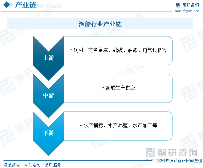 渔船行业产业链上游为原材料供应环节,主要钢材、有色金属、线缆、油漆、电气设备等;中游为渔船生产供应环节;下游主要应用于水产捕捞、水产养殖、水产加工等领域。