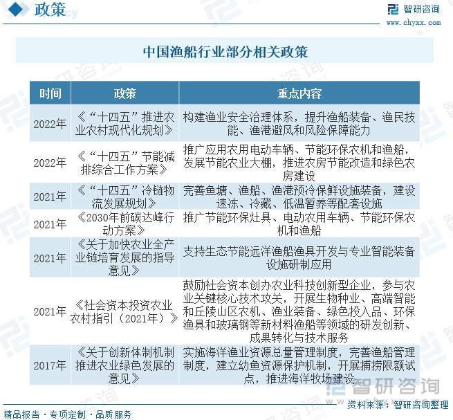 近些年来,为了促进渔船行业的发展,我国陆续发布了许多政策,如2022年发布的《“十四五”推进农业农村现代化规划》构建渔业安全治理体系,提升渔船装备、渔民技能、渔港避风和风险保障能力。