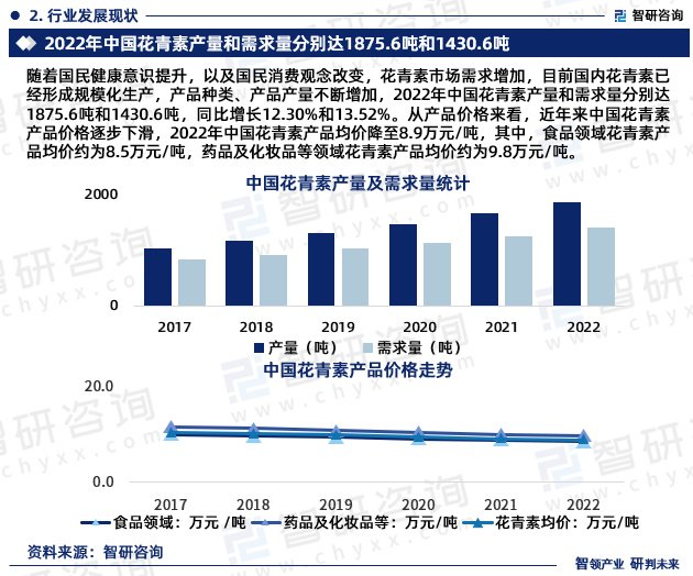 随着国民健康意识提升,以及国民消费观念改变,花青素市场需求增加,目前国内花青素已经形成规模化生产,产品种类、产品产量不断增加,2022年中国花青素产量和需求量分别达1875.6吨和1430.6吨,同比增长12.30%和13.52%。从产品价格来看,近年来中国花青素产品价格逐步下滑,2022年中国花青素产品均价降至8.9万元/吨,其中,食品领域花青素产品均价约为8.5万元/吨,药品及化妆品等领域花青素产品均价约为9.8万元/吨。
