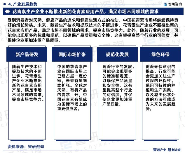 受到消费者对天然、健康产品的追求和健康生活方式的推动,中国花青素市场将继续保持良好的增长势头。未来,随着生产技术和提取技术的不断进步,花青素生产企业不断推出新的花青素应用产品,满足市场不同领域的需求,提高市场竞争力。此外,随着行业的发展,可能会出现更多的标准和规范,以确保产品质量和安全性,这有望提高整个行业的可信度,并促使企业更加注重产品质量。
