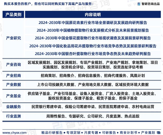 1:本报告核心数据更新至2023年12月,以中国大陆地区数据为主,预测区间涵盖2024-2030年,数据内容涉及花青素重点产品产量、需求量、市场规模、产品价格等。