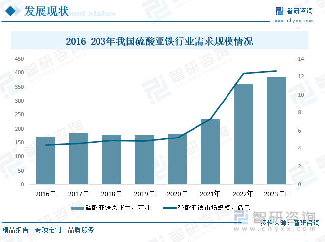 随着我国建筑业、农业、皮革业等行业的发展,对硫酸亚铁的需求不断增加。特别是建筑业的快速发展,对硫酸亚铁的需求量更是迅猛增长。因此,硫酸亚铁行业市场前景广阔,市场需求量大。2022年我国硫酸亚铁市场需求总量为359.46万吨,较2021年增长125.08万吨;硫酸亚铁市场规模12.4亿元,较2021年增长5.06亿元。预计2023年我国硫酸亚铁市场需求总量为386.52万吨,硫酸亚铁市场规模为12.66亿元。