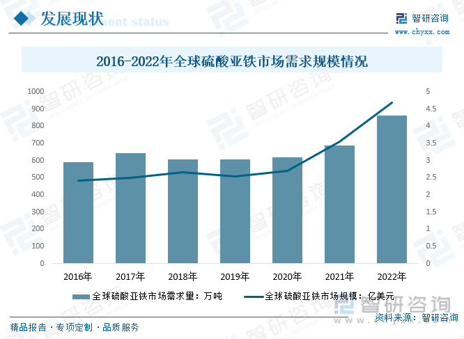 硫酸亚铁是一种重要的化学品,在全球范围内都有广泛的应用。随着全球经济的不断发展,相关行业对硫酸亚铁的需求也在逐渐增加。特别是在钢铁、制药、冶金等行业中,硫酸亚铁作为催化剂和添加剂的作用愈发凸显。2022年,全球硫酸亚铁市场需求量增长至862.01万吨,较2021年增长172.66亿万吨;硫酸亚铁市场规模达到4.69亿美元,较2021年增长1.14亿美元。