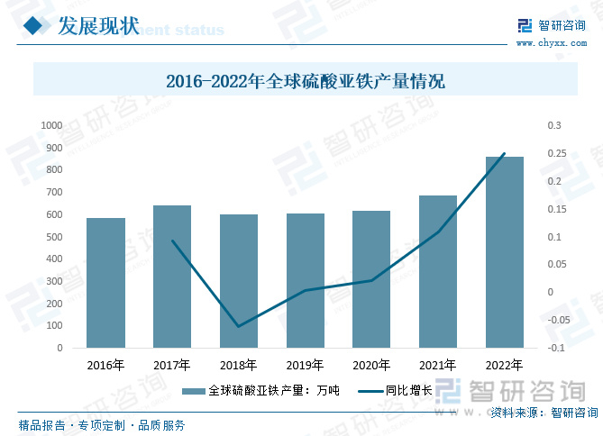 目前世界上硫酸亚铁的生产技术已经相当成熟,并有许多国家都具备生产硫酸亚铁的能力。2022年全球硫酸亚铁产量:万吨,较2021年增长172.66万吨。
