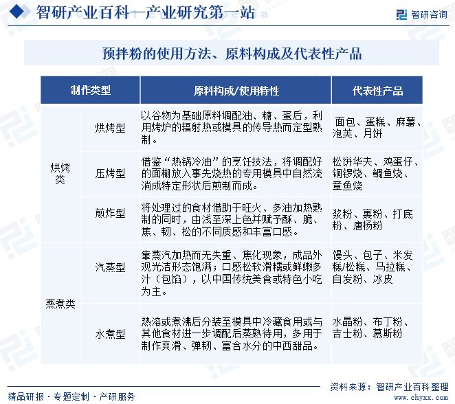 预拌粉是对制作面点所需的多种原料材料提前进行精准配比,预先混合好,然后销售给客户使用的烘焙原料。预拌粉是人们在制作面点时最常用到的一种产品,能够提高制作面点的成功率。目前预拌粉产品包括曲奇、蛋糕、面包、松饼等多种类的原料。预拌粉的使用方法、原料构成及代表性产品情况如下:
