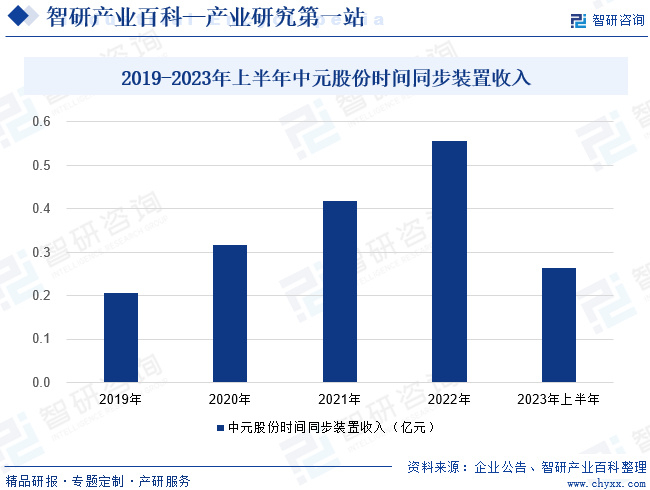 武汉中元华电科技股份有限公司位于国家自主创新示范区——武汉东湖新技术开发区,是高新技术企业,作为全国首批创业板28家上市企业之一,公司股票于2009年在深圳证券交易所上市交易。中元股份主要从事电力系统智能化记录分析、时间同步、变电站综合自动化和配网自动化相关产品的研发、制造、销售和服务。主营产品有电力故障录波装置、时间同步装置和变电站综合自动化装置、智能配网设备、智能电网测试仪器仪表等。中元股份生产的ZH-502/505 时间同步装置,在变电站、发电厂、厂矿企业等领域处于市场领先地位。2019-2023年中元股份时间同步装置收入保持增长态势,2022年收入为0.56亿元。2023年上半年中元股份时间同步装置收入同比增长34.54%,为0.26亿元。