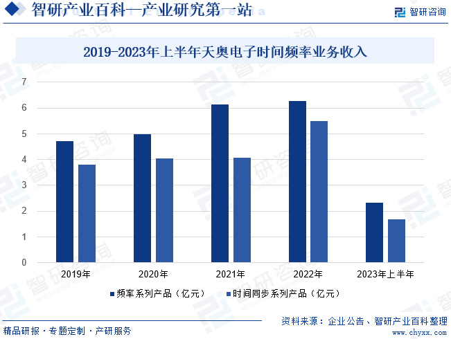 成都天奥电子股份有限公司成立于2004年1月,2018年在深交所上市。公司作为国内领先的时间频率企业,拥有完整的时间频率产品线,具备时频系统集成能力,可为客户提供完整的时频解决方案。企业时间频率产品应用于航空航天、卫星导航、军民用通信及国防装备等领域,为我国载人航天、探月工程、北斗卫星导航系统等国家重大工程建设提供了主要时频装备和系统,做出了重要贡献。2022 年,公司作为量子精密测量领域原子钟产品率先产业化的单位,加入了“量子信息网络产业联盟”。2023年上半年天奥电子时间频率业务收入总计4.01亿元;其中频率系列产品收入2.32亿元,同比增长59.30%;由于机载配套电源组件产品线收入下滑,导致时间同步系列产品收入同比减少27.48%,为1.68亿元。
