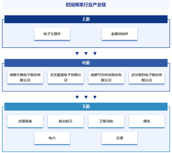 时间频率行业的上游主要为电子元器件制造业和金属制品业,下游主要是武器装备、航空航天、军事通信、卫星导航等国防科技领域和通信、电力、交通、物联网等国民经济领域。时间频率产业链如下图所示: