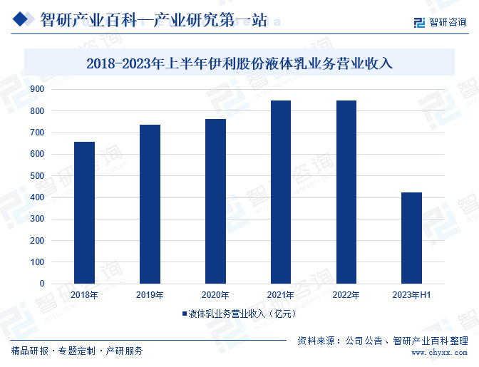 近年来,公司通过有机业务引领产品品质升级,推动金典有机纯牛奶系列产品零售量同比保持双位数增长;同时聚焦消费者“健康+功能”需求,在功能性品类赛道上不断创新与突破。2023年以来,伊利股份相继推出“金典”A2β、活性乳铁蛋白等有机牛奶系列产品、“舒化”安糖健无乳糖牛奶以及“安慕希”与“畅轻”0蔗糖低GI系列酸奶等创新型产品,进一步扩大了液态新品的收入增量贡献。2023年上半年公司实现营业总收入661.97亿元,较上年同期增长4.31%,其中液体乳业务实现营业收入424.23亿元,整体零售额市占份额继续稳居行业第一。