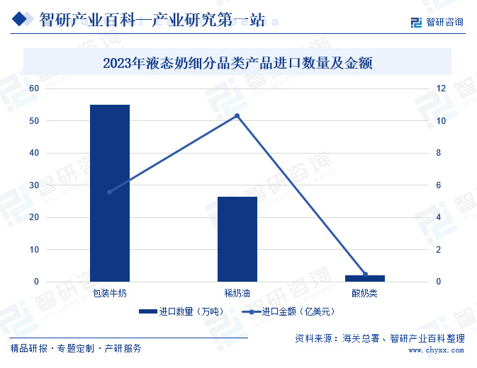 摘要:现阶段,国内液体乳产品在国际上的竞争优势较小,我国对于国外液体乳产品仍保持较高的需求。为此,我国持续加大对液体乳行业的扶持力度,鼓励各企业加大产品的研发投入,推出高质量的新产品,稳步提高国内液体乳的竞争力。近年来,随着我国液体乳行业的快速发展,国产品牌正强势崛起,实现部分细分领域进口替代,液态奶进口量持续下滑。2023年我国共计进口液态奶83.52万吨,同比减少16.5%,进口额16.39亿美元,同比下降2.2%。