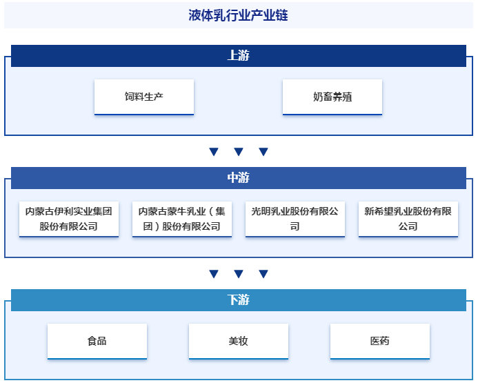液体乳产业链上游是奶源供应,包括饲料生产、奶畜养殖。饲料的质量影响奶畜的营养摄入,为液体乳品质保障的基础。养殖技术与管理则决定奶畜的健康与生产力,为液体乳提供稳定的奶源。中国液体乳行业产业链如下图所示: