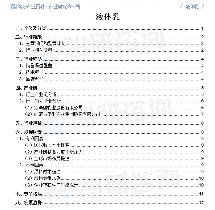 智研产业百科是智研咨询推出的产研工具平台,致力于为您提供全方位的百科式产业信息查询服务。智研咨询践行用信息驱动产业发展的企业使命,完善和丰富企业方法论,依托产业百科平台提升信息价值,持续为行业发展及企业投资决策赋能。液体乳产业百科作为液体乳产业一站式系统化研究工具,全面归纳了液体乳产业知识信息,内容涵盖液体乳产业的定义、分类、政策、产业链、竞争格局、发展趋势等,并依靠信息技术建立智能互链的行业知识图谱,为行研从业者及相关投资者提供深入的洞察力和全面的信息。