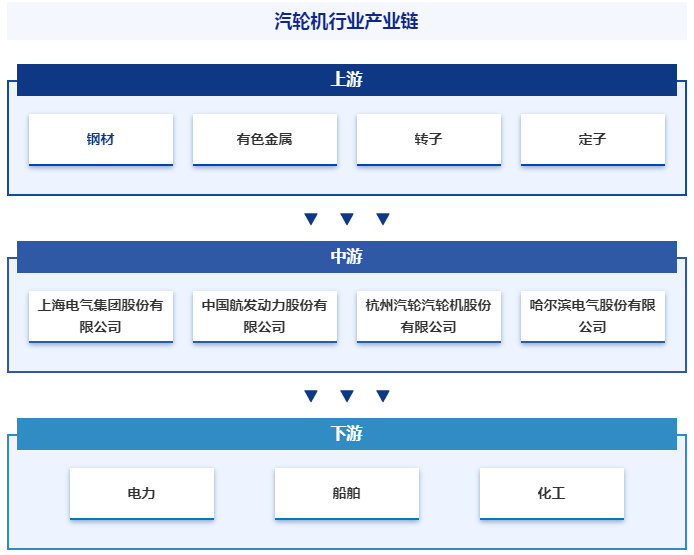 汽轮机产业链上游主要是钢材、有色金属等原材料和主体及辅助设备等组件,其中,组件包括转子、定子、凝汽器、除氧器等。产业链中游主要为汽轮机生产制造。产业链下游为汽轮机的主要应用领域,包括电力、船舶、化工等行业。