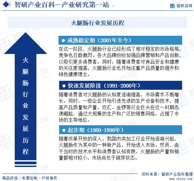 我国火腿肠行业经历了从起步到快速发展,再到成熟稳定三个发展阶段。步入21世纪后,火腿肠行业进入成熟稳定期,市场竞争日趋激烈,各大品牌纷纷加强品牌营销和产品创新,以维持市场地位。同时,消费者对食品安全和健康的关注度不断提高,也促使火腿肠行业更加注重产品质量的提升和绿色健康理念。总体而言,火腿肠行业从起步到成熟,经历了不断的发展和变革,如今已成为我国肉类加工行业的重要组成部分。