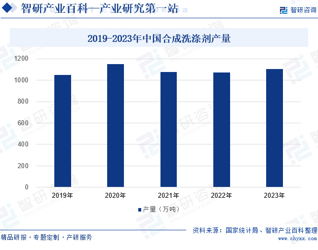 洗涤剂可以分为肥皂和合成洗涤剂,合成洗涤剂是目前洗涤剂市场的主导产品,占据约九成的市场份额。一方面国家环保政策加严导致合成洗涤剂产能扩张趋缓,另一方面,国内洗涤剂市场逐渐饱和,市场竞争激烈。因此,近几年国内合成洗涤剂产量增速较为缓慢。2023年中国合成洗涤剂产量为1106.4万吨,同比增长3.3%。在政策和市场的驱动下,我国洗涤剂企业加快技术升级,推出更多绿色高效的洗涤产品。同时,政策鼓励洗涤剂企业开拓国际市场,企业将加快全球市场布局,有望推动我国合成洗涤剂产量上涨。