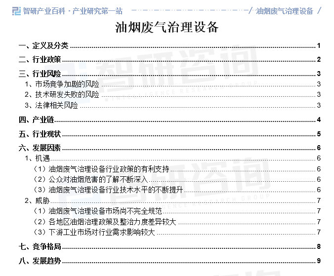 智研产业百科是智研咨询推出的产研工具平台,致力于为您提供全方位的百科式产业信息查询服务。智研咨询践行用信息驱动产业发展的企业使命,完善和丰富企业方法论,依托产业百科平台提升信息价值,持续为行业发展及企业投资决策赋能。油烟废气治理设备产业百科作为油烟废气治理设备产业一站式系统化研究工具,全面归纳了油烟废气治理设备产业知识信息,内容涵盖油烟废气治理设备产业的定义、分类、政策、产业链、竞争格局、发展趋势等,并依靠信息技术建立智能互链的行业知识图谱,为行研从业者及相关投资者提供深入的洞察力和全面的信息。