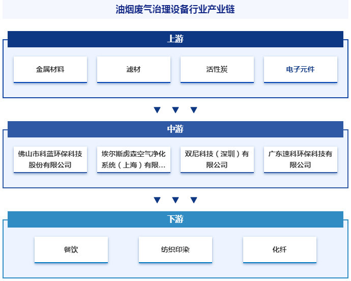 油烟废气治理设备产业链可以分为上游、中游和下游三个部分。产业链上游包括原材料和生产设备,原材料有金属材料、滤材、活性炭等,金属材料可能涉及钢铁、铝合金等,而滤材可能是特制的纤维材料,活性炭则需要特殊的处理以增强吸附效果,其次还包括电子元件及机械设备、工具等。中游部分是设备制造商和组装商,主要包括油烟废气治理设备设计、制造、装配、测试等环节。产业链下游应用于餐饮以及纺织印染、化纤等工业领域,油烟废气治理设备行业发展与下游行业的油烟治理政策以及行业总体发展状况密切相关。