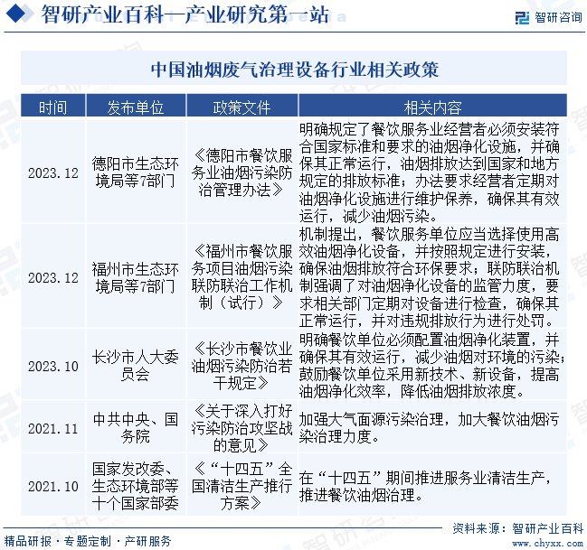 油烟废气治理设备属于专用设备制造行业,产品主要用于餐饮和工业油烟废气治理领域,受到国家环保法律法规、产业政策的支持。近年来我国国务院、中央多部委及各主要省市相继出台了一系列的政策、规划及标准等,有力推动了环保产业的发展,对于行业内企业的发展也具有积极影响。随着我国对大气污染的重视程度日益提高,以及《“十四五”全国清洁生产推行方案》、《关于深入打好污染防治攻坚战的意见》等相关环保政策、法规的陆续出台,进一步推进了大气污染治理行动的开展。同时,德阳、福州、长沙等地方政策相继出台,对餐饮服务业的油烟设备提出了明确要求,包括设备的选择、安装、运行维护以及更新升级等方面,这些政策旨在通过规范油烟设备的使用和管理,减少油烟污染,保护大气环境。
