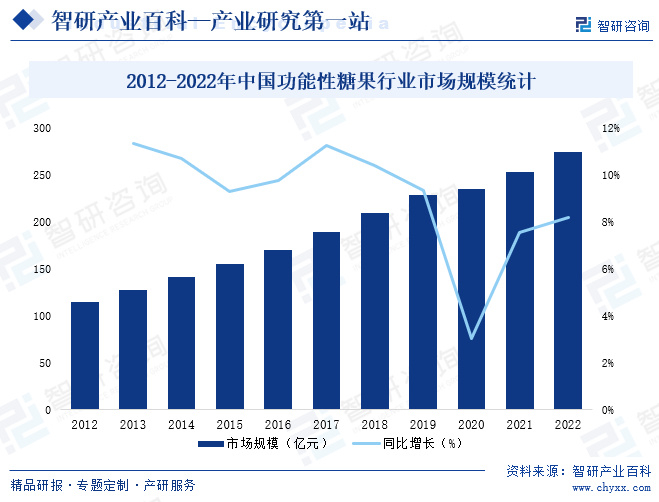 摘要:随着国民健康意识的不断提升,消费者越来越重视健康和营养,寻求既美味又具有健康益处的食品,功能性糖果作为满足甜食欲望的同时提供营养功能的选择,深受广大消费者的喜爱,2022年中国功能性糖果市场规模达274.12亿元,同比增长8.21%。