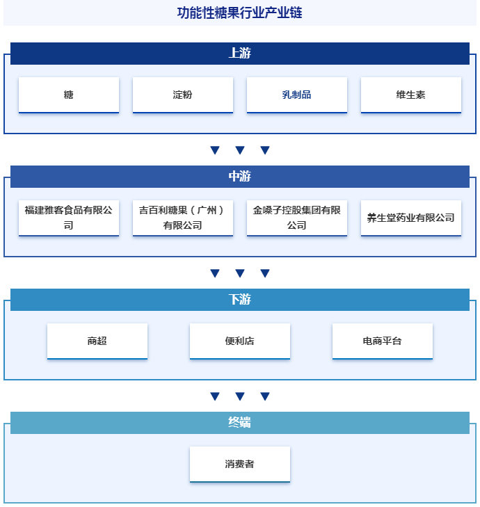 功能性糖果上游主要包括糖、淀粉、乳制品等原材料以及食品添加剂、食品包装材料等,上游市场成熟,技术稳定,市场竞争比较激烈,从业人员及企业众多,能够有力支持功能性糖果行业的快速发展。下游为销售环节,通过商超、便利店、电商平台等多种渠道,最终到达消费者手中。
