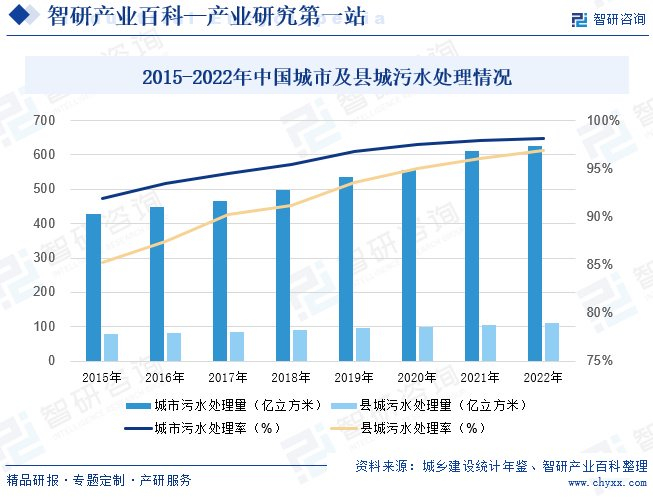 伴随、近年来,我国城镇的快速发展,“城镇化”国家战略的快速推进以及各类工业化 工单位的技术变革,城镇污水排放量逐年增多。2022年我国城乡污水排放量为638.97亿立方米,同比增长2.22%,县城污水排放量为114.93亿立方米,同比增长5.14%。伴随着污水处理设施建设的稳步增长,污水收集管网的有序规划建设,污水处理量也在稳步提升。在城镇化率的稳步增长、污水提质增效、水环境治理下,“十四五”初期,污水处理设施建设会有一定的增幅,但“十四五”中后期增速会放缓,2015年我国城市及县城污水处理量分别为428.83亿立方米和78.95亿立方米,至2022年增长为626.89亿立方米和111.41亿立方米。年均复合增长率分别为5.57%和5.04%。2022年城市污水处理率来到了98.11%,县城污水处理率为96.94%。