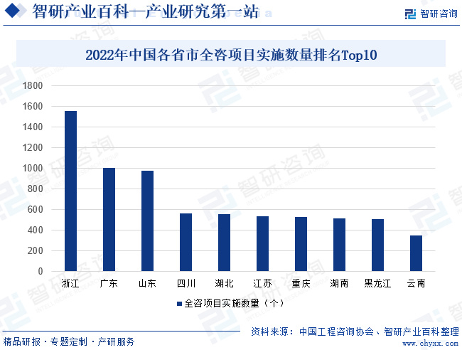 我国于20世纪80年代推行了对外开放政策,自此以后,国民经济迅猛发展,基建规模与日俱增,尤其是房地产等行业实现了高速发展,这也为工程咨询行业的发展起到了一定的促进作用,历经30余年的发展,工程咨询市场从零开始起步,市场业务也渐渐由政府行为转变为市场行为,并取得了重要突破。据统计,到2022年年末为止,我国符合资质要求的工程咨询企业数量已超出7000家,而在2012年,此类企业仅为1700家以上。从工程咨询项目实施情况来看,2022年以浙江、广东、山东、四川、湖北等省份居多,我国工程咨询业务发展较为迅猛的地区主要分布在广东、浙江、山东等沿海经济较为发达的省份。