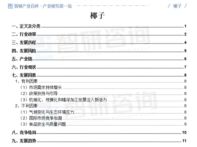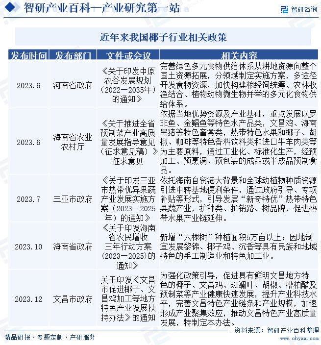 智研产业百科是智研咨询推出的产研工具平台,致力于为您提供全方位的百科式产业信息查询服务。智研咨询践行用信息驱动产业发展的企业使命,完善和丰富企业方法论,依托产业百科平台提升信息价值,持续为行业发展及企业投资决策赋能。椰子产业百科作为椰子产业一站式系统化研究工具,全面归纳了椰子产业知识信息,内容涵盖椰子产业的定义、分类、政策、产业链、竞争格局、发展趋势等,并依靠信息技术建立智能互链的行业知识图谱,为行研从业者及相关投资者提供深入的洞察力和全面的信息。