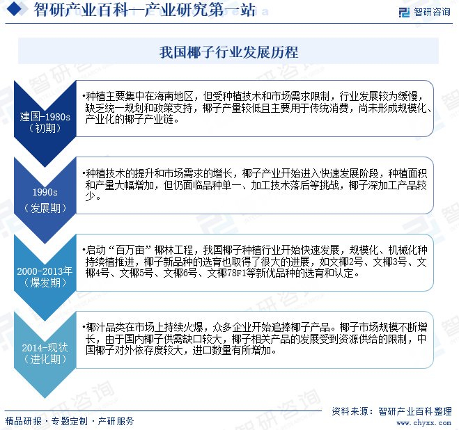 我国椰子行业从建国初期到80年代,椰子种植主要集中在海南地区,受限于种植技术和市场需求,行业发展缓慢,产量低且主要用于传统消费。进入90年代,随着种植技术的提升和市场需求增长,椰子产业开始快速发展,种植面积和产量大幅增加,但仍面临品种单一和加工技术落后等挑战。进入21世纪后,通过实施“百万亩”椰林工程,我国椰子种植行业进一步加速发展,新品种选育取得显著进展。然而,随着椰汁市场的火爆,国内椰子供需缺口逐渐显现,对外依存度增加,进口数量有所上升。总体来看,我国椰子行业经历了从缓慢发展到快速崛起的过程,但仍面临资源供给和加工技术等方面的挑战。
